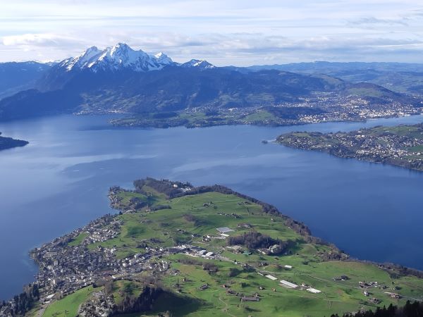 A pied au départ de l'hôtel, direction le téléphérique (compris dans le tarif) qui nous monte sur la montagne du Rigi, interdite aux voitures.