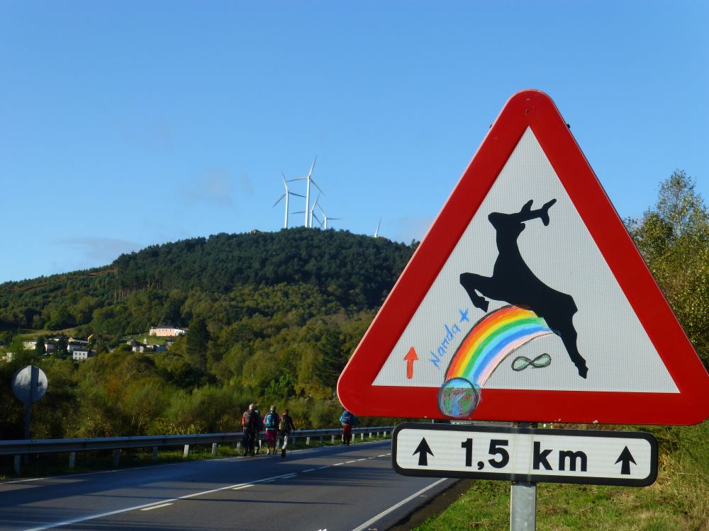Finalement tout ce monde nous donne de l’élan, on sent la fin proche et on avale les kilomètres sous les forêts d’eucalyptus, à travers les petits villages et les traces de pèlerins d’hier et d’aujourd’hui. 33 km (tout plat)