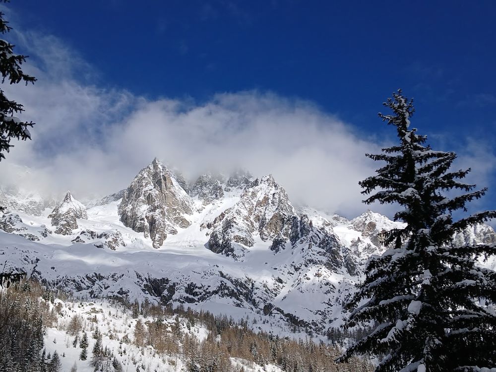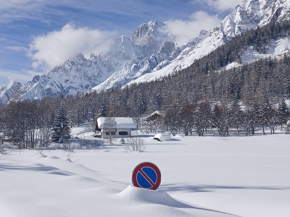 Sur le chemin du retour, magnifique balade balade au pied du Mont Blanc dans le Val Ferret enneigé au pied des 4000 m : Grandes Jorasses, Dent du Géant