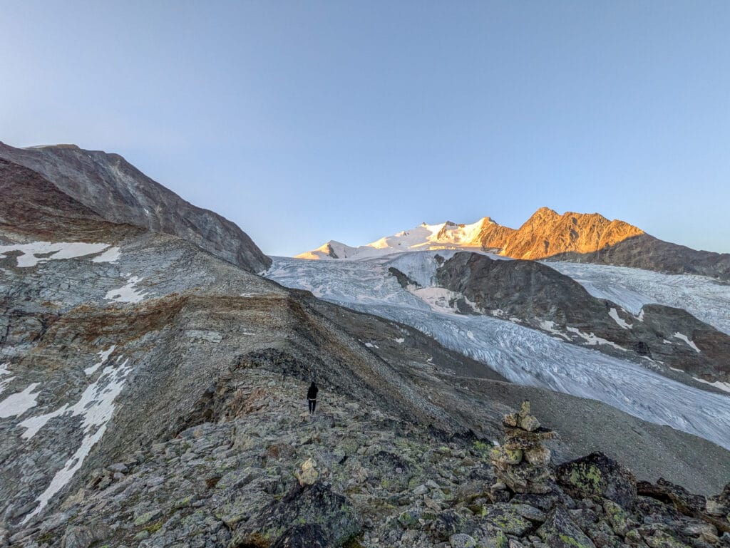 Le chemin évite dorénavant le glacier et est facilité, arrivée et repos à la cabane, prêt pour le lendemain !