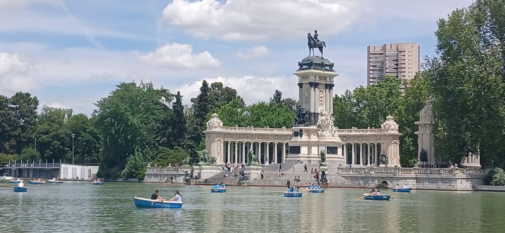 Puis par de belles rues souvent piétonnes, direction l’immense parc du Retiro 125 hectares, ancien parc royal avec ses nombreux palais notamment le Palais de Crystal et un tour en barque sur le lac