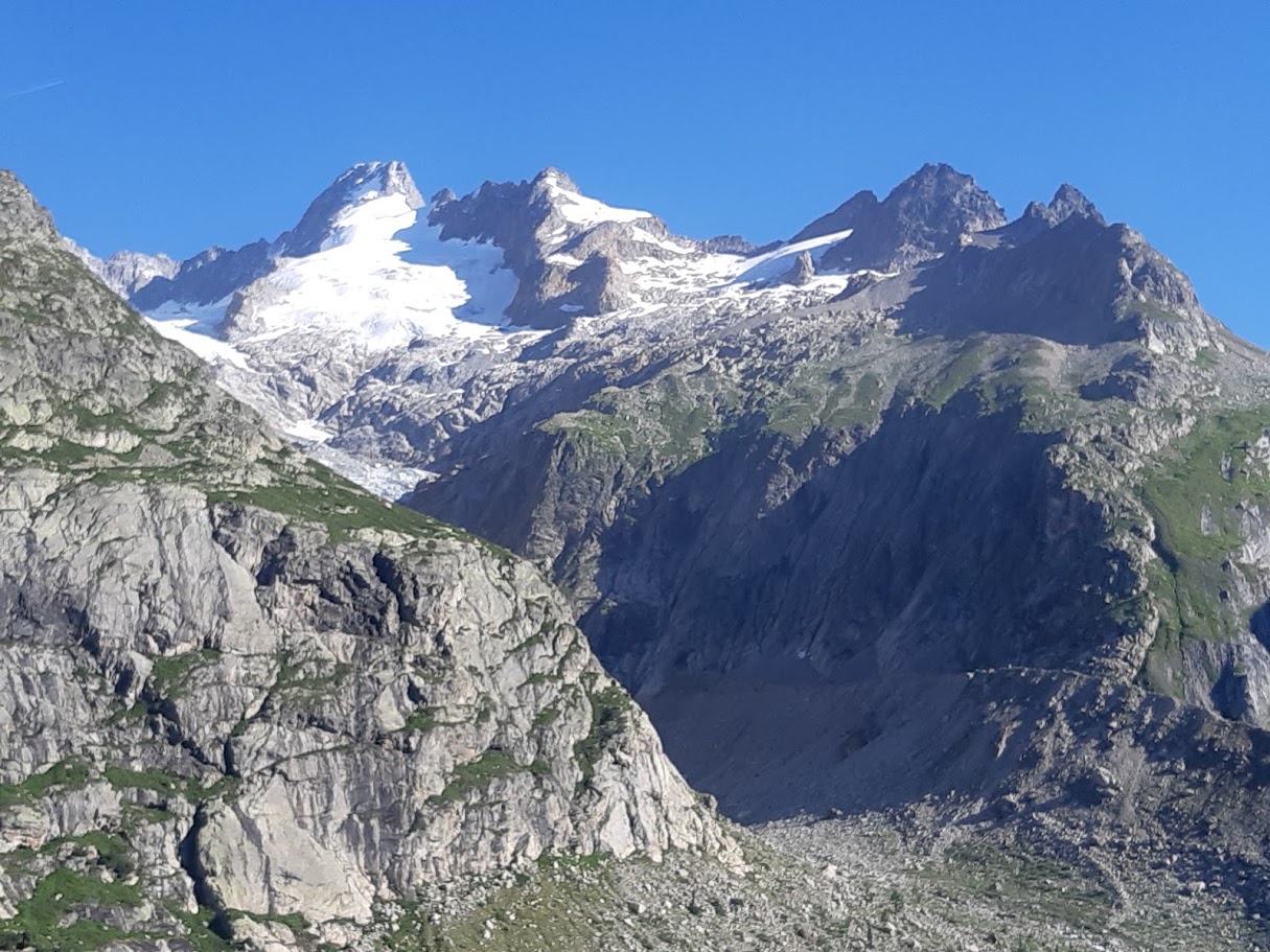 Jour 04 : Le Col de la Seigne (2516 m) marque l'entrée du Val d'Aoste et de l'Italie. Le Mont-Blanc nous y apparaît sous son versant le plus sauvage. Nous descendons le Val Veni jusqu'à l'énorme moraine du glacier de Miage qui barre toute la vallée. Un petit crochet nous conduit au Lac de Miage, coincé entre la moraine et le glacier.