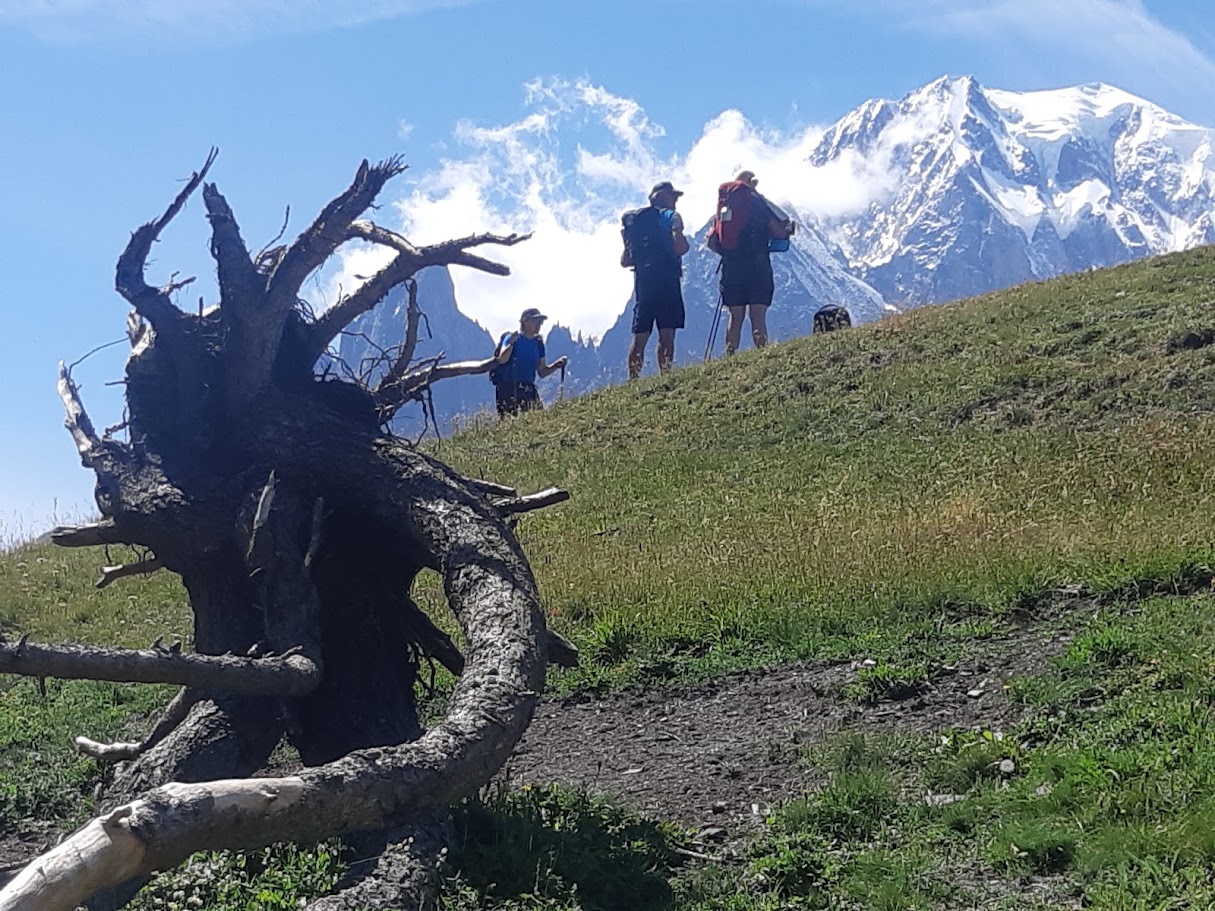 Après avoir longé le Bisse de Trient (canal d'amenée d'eau, creusé dans le roc), nous gravissons le sentier menant aux Bergeries des Grands (2113 m), au-dessus du Glacier du Trient. Un itinéraire en balcon nous conduit au Col de Balme (2191 m) où nous retrouvons la France et la vallée de Chamonix. Le Mont-Blanc nous y apparaît sous le versant chamoniard découvert neuf jours plus tôt. La descente nous ménage de très belles vues sur le Glacier du Tour et l'Aiguille Verte. Nuit au village du Tour, au pied du glacier.